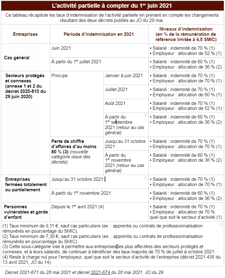Synthèse indemnisation et allocation d’activité partielle à compter du 1er juin 2021