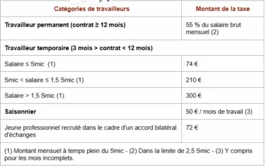 Le montant de cette taxe dépend de la durée, de la nature du contrat de travail et de la rémunération du travailleur étranger.