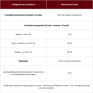 Le montant de cette taxe dépend de la durée, de la nature du contrat de travail et de la rémunération du travailleur étranger.
